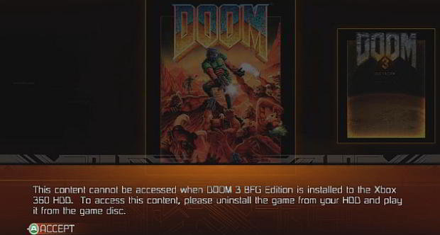 Bethesda is recommending that you play Doom 3 BFG on your Xbox 360 off the disk if you want to play the original Doom packaged with the game. Why? A glitch in the program makes Doom inaccessible if Doom 3 BFG is installed on the hard drive.