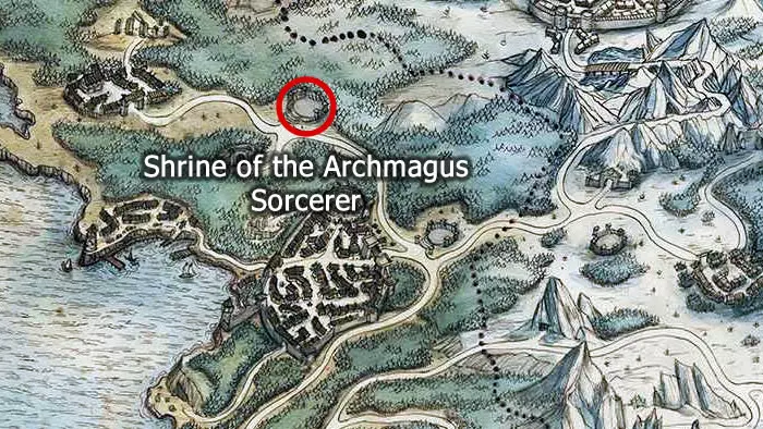 The Shrine of the Archmagus is situated between Victors Hollow and Duskbarrow in the area known as East Duskbarrow Trail. From the Duskbarrow town entrance, turn north at the save point and follow the long winding path until just after the treasure chest. From there, look for the path obscured by fog to the north. Follow the new path after it turns back west, past the treasure chest, until the party arrives at the shrine entrance near a number of broken stone columns.
