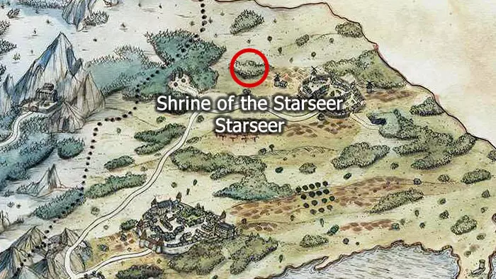The Shrine of the Starseer is hidden out of sight just west of Wispermill in the area known as the Western Wispermill Flats. Follow the trail west from Wispermill just until the fence posts end, then turn north down the hill toward the old cart and tree. From there, turn west and keep walking straight into the shrine.