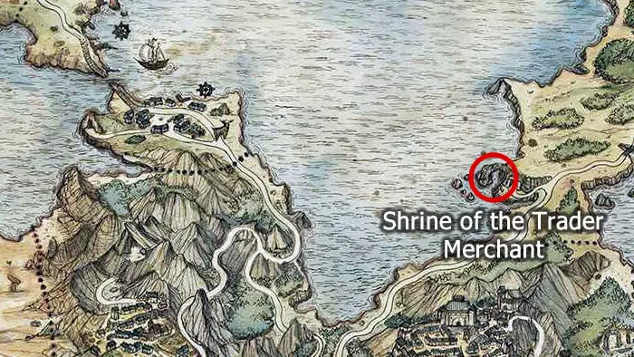 The Shrine of the Trader is situated just north of Northgard, accessible from the junction known as the Moonstruck Coast. Follow the sand due west and follow the shore through a stone archway, then continue as the beach wraps around further west before turning north. When reaching a dead end on the north side, turn due east and walk straight into the rocks to discover the cave entrance.