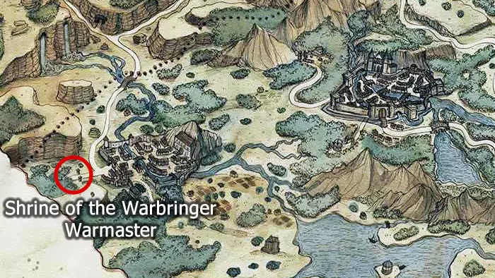 The Shrine of the Warbringer is located west of Riverford in the area known as the North Riverford Traverse. From the town entrance, follow the trail and the torches due west past the point where the path turns north toward a bridge. When the path dead ends at a rock wall, turn south and then west to reach the shrine entrance.